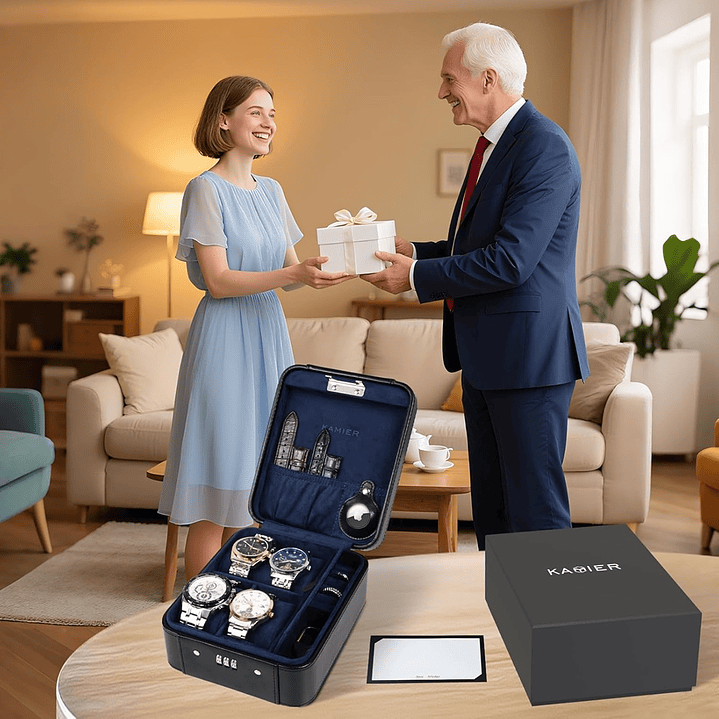 Regalo ideal para hombres: la funda de viaje Kamier para hombre viene con un embalaje de regalo, lo que hace que la caja de almacenamiento de relojes sea el regalo perfecto para coleccionistas de relojes y amantes de los viajes en el Día del Padre, cumpleaños, aniversarios, Día de San Valentín, Navidad.