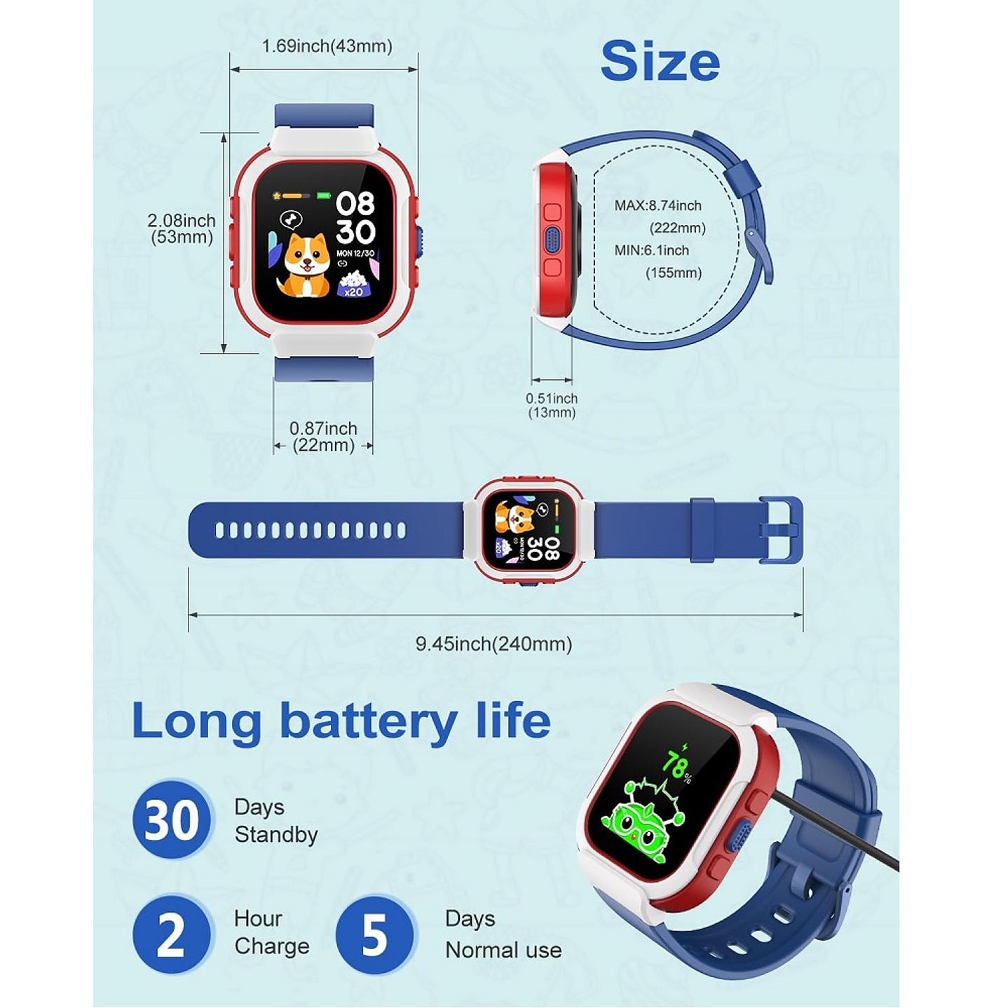 Batería de larga duración y resistencia al agua IP68: la duración de la batería de hasta 5 días resuelve el problema de la carga frecuente para ti, la impermeabilidad IP68 de alta calidad permite que tus hijos disfruten de más actividades acuáticas.